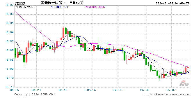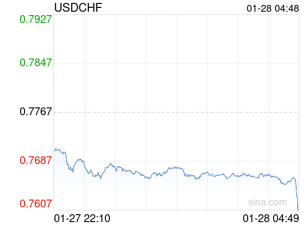 新浪外汇消息2026年01月28日,截至04时48分,外汇市场上美元兑瑞士法郎汇率跌破1美元兑换0.7604瑞士法郎。跌幅为-2.0986%