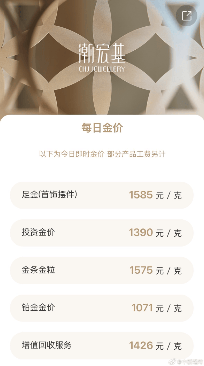 周大福、潮宏基足金饰品均报价1585元/克,单日上涨7元/克;