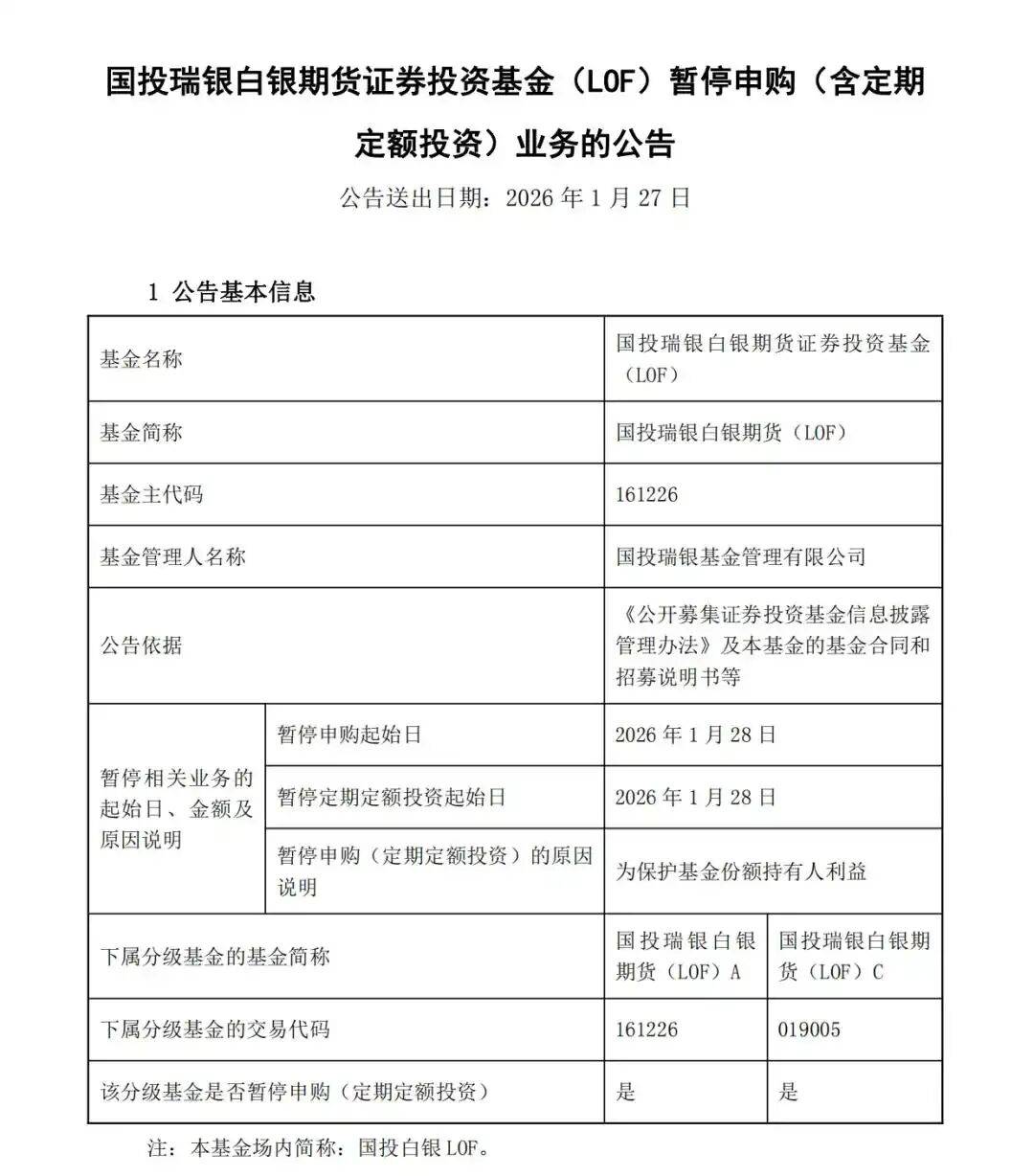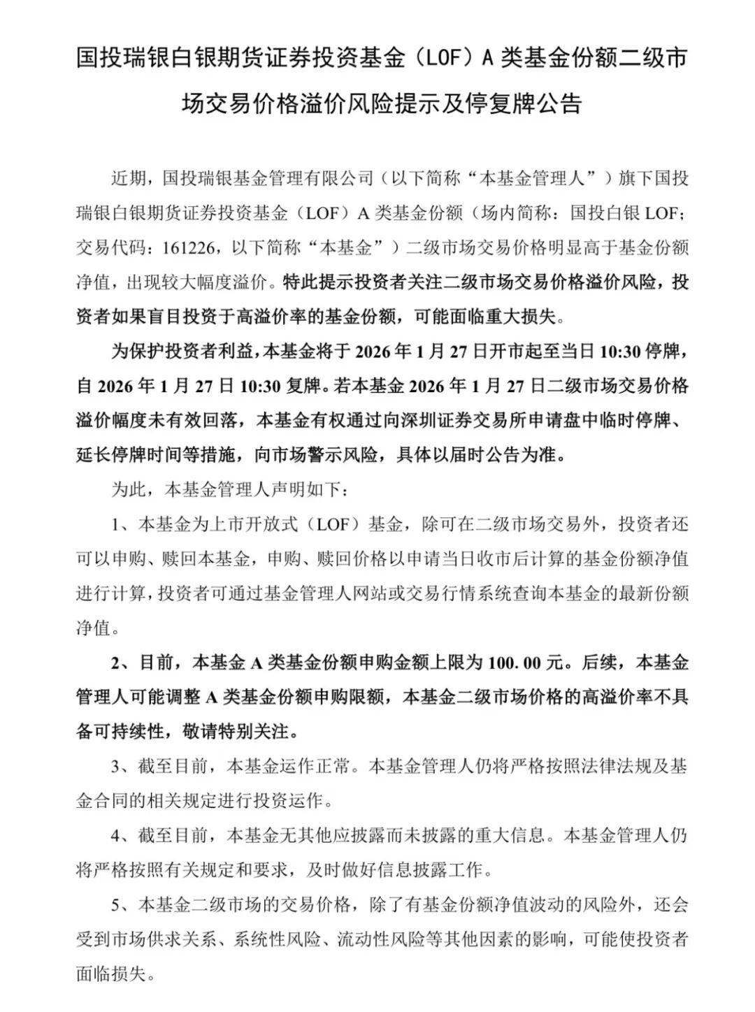 22日,国投白银LOF发布公告称,该基金21日收盘价明显高于基金份额净值,投资者如果盲目投资于高溢价率的基金份额,可能面临重大损失。国投白银LOF于2026年1月22日开市起停牌至收市。