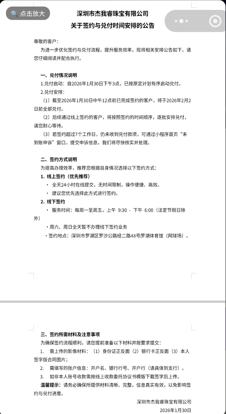 近期,有投资者在社交平台上晒出杰我睿关于签约与兑付时间安排的公告。公告称,自2026130日下午3点,已按原定计划有序启动兑付。兑付安排:截至2026130日中午12点前已完成签约的客户,将于202622日前全部兑付。后续通过线上签约的客户,将按照签约的时间顺序,逐批安排兑付。