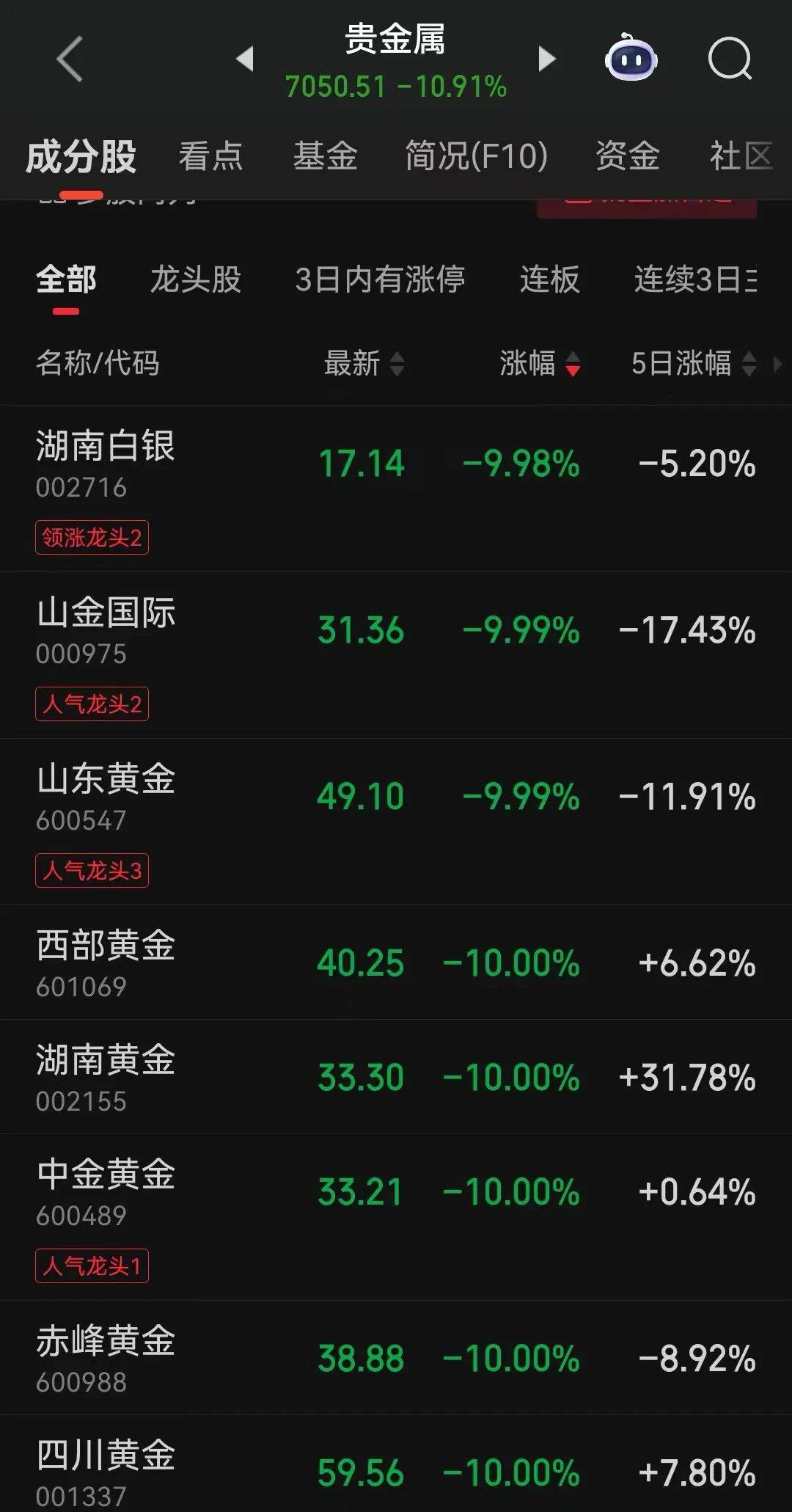 板块方面,贵金属板块领跌,黄金、白银等个股全线跌停。