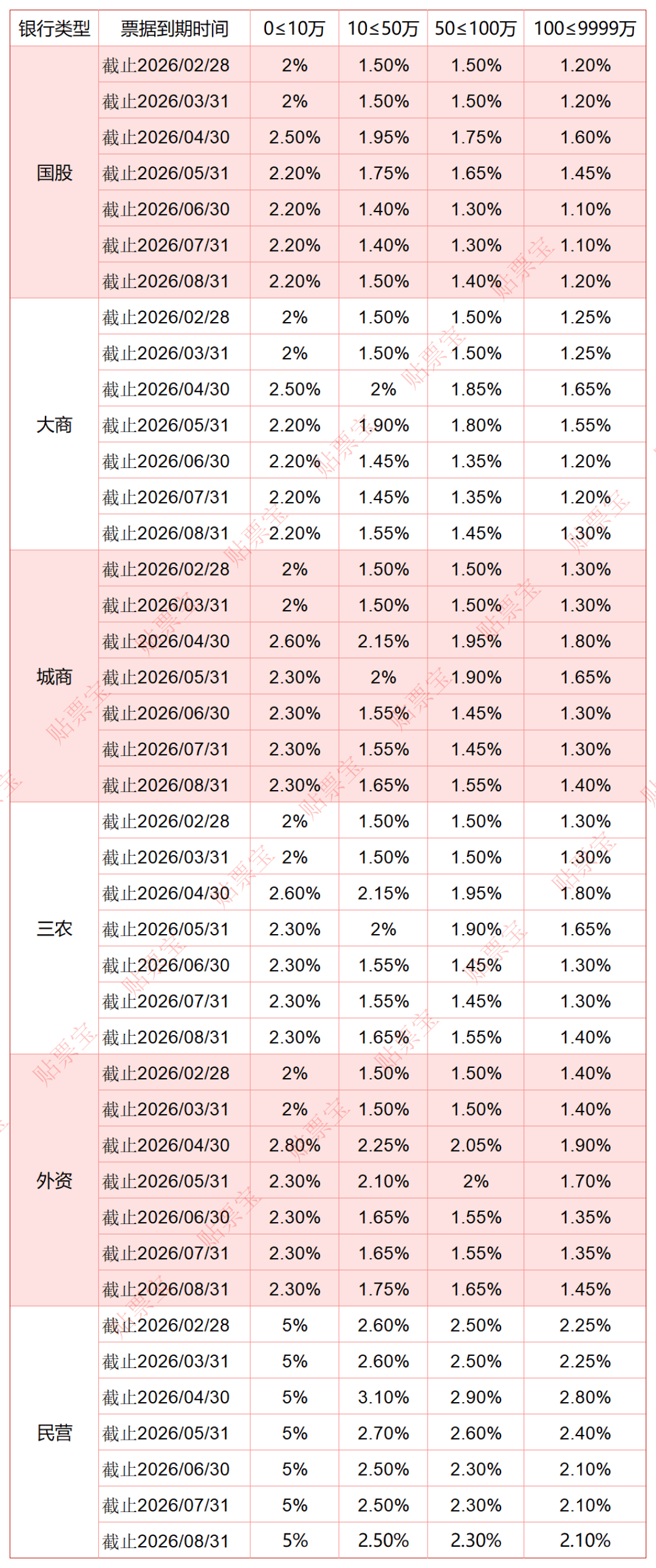 以下为2026年2月2日的银行承兑汇票贴现利率报价表(来源贴票宝):