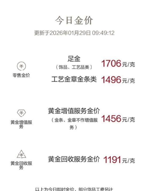 1月29日,各大品牌金饰报价集体刷新纪录,老庙黄金涨到1722元/克,单日涨104元;周生生1708元/克,涨94元;老凤祥1713元/克,涨93元,齐刷刷突破1700元关口。