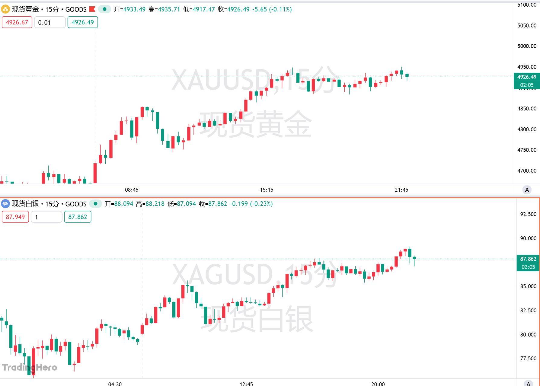 金银价格在经历上周开启的一轮重挫后,于周二迎来反弹。国际现货黄金一度重回4950美元/盎司,日内涨幅扩大至6%。国际白银价格涨势更猛,一度站上89美元/盎司,日内涨近12.5%。