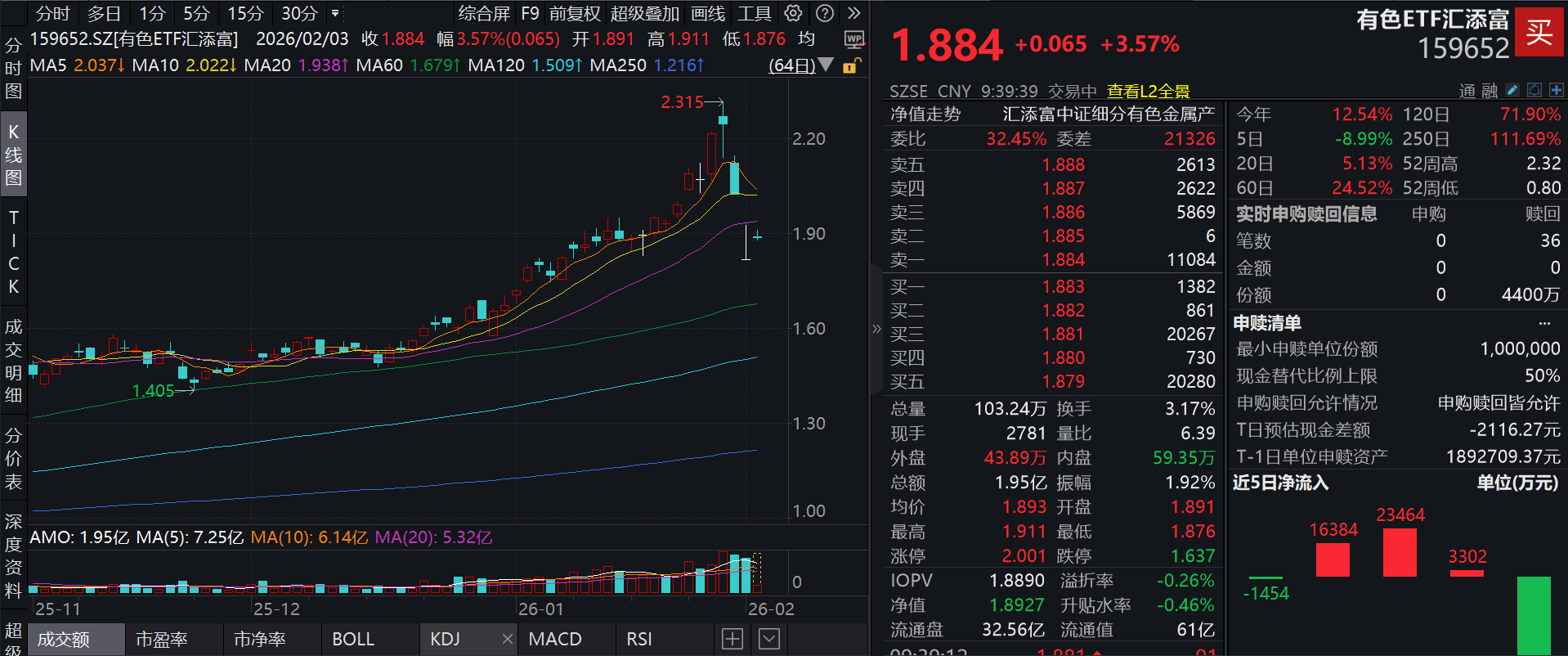 流动性方面,有色ETF汇添富盘中换手3.17%,成交1.95亿元。拉长时间看,截至2月2日,有色ETF汇添富近1年日均成交1.20亿元。