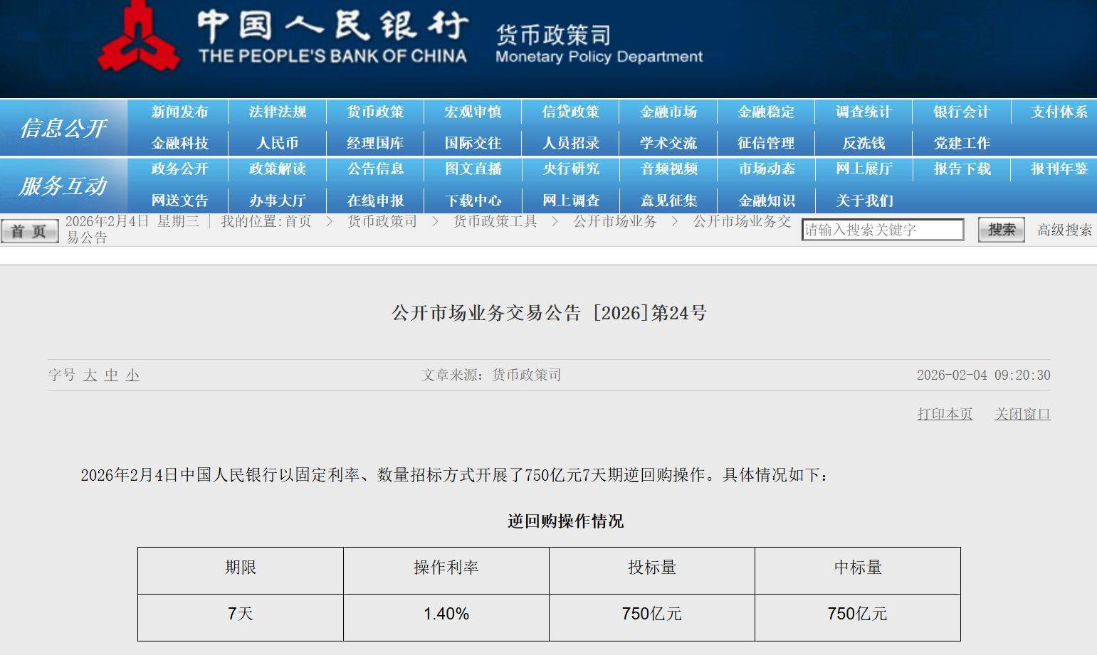 此外,2月4日,央行公告称,以固定利率、数量招标方式开展了750亿元7天期逆回购操作,操作利率为1.4%。因今日有3775亿元7天期逆回购和7000亿元3个月(91天)买断式逆回购到期,叠加央行开展的8000亿元3个月(91天)买断式逆回购操作,实现净回笼2025亿元。