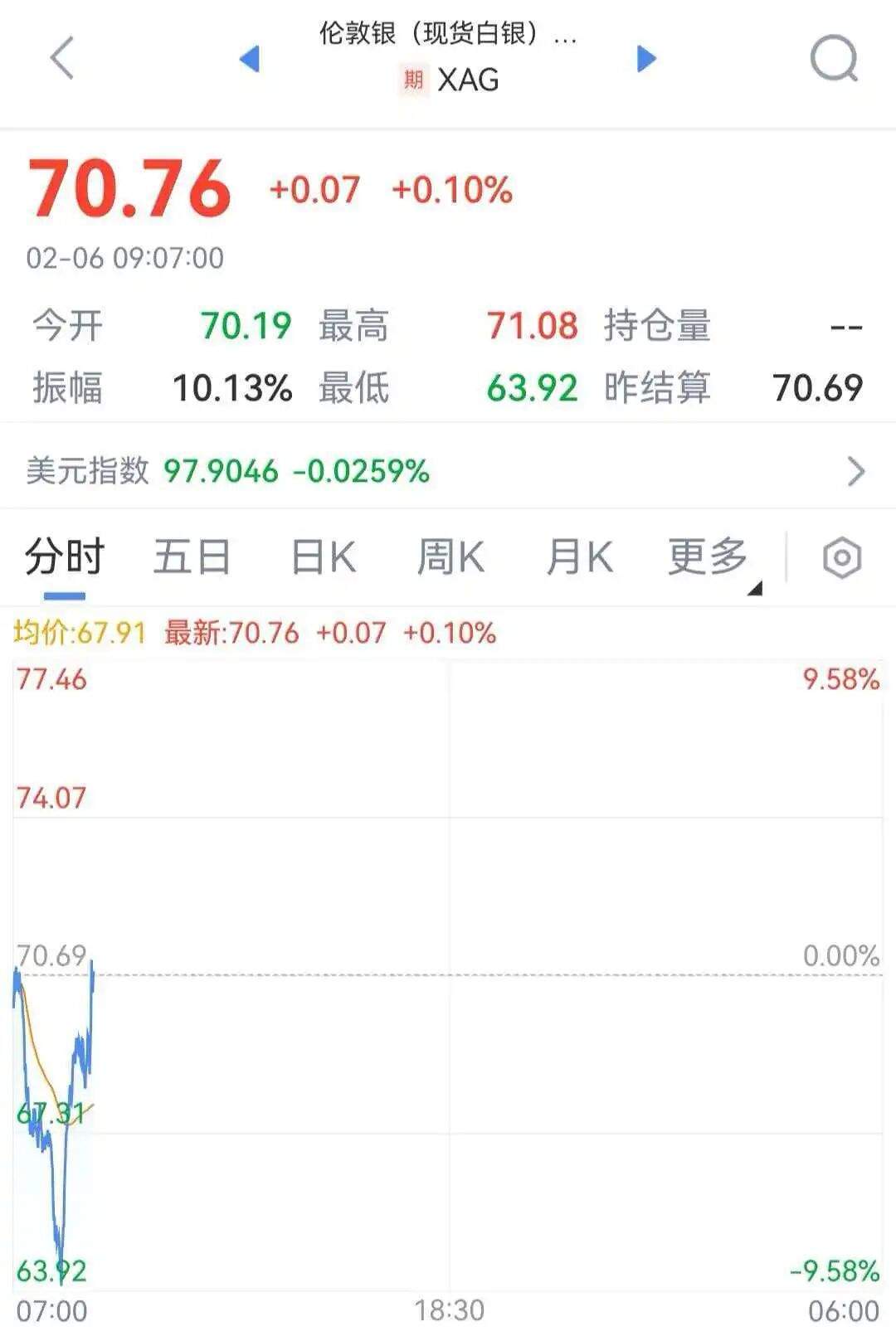 现货白银日内转涨,此前一度跌近10%。