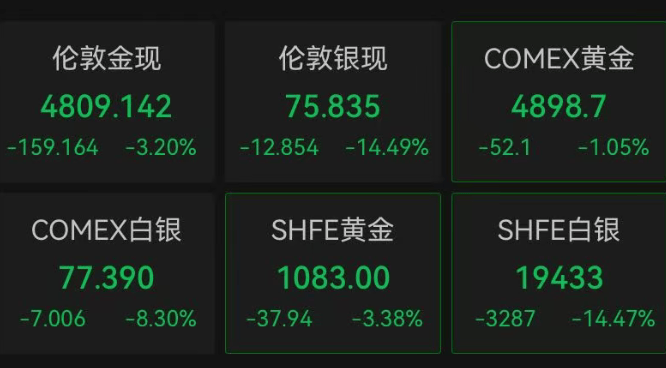 2月5日盘中,贵金属价格继续下跌。截至发稿,现货黄金日内跌超3%,现报4809美元/盎司;现货白银日内跌14%,现报75.83美元/盎司。