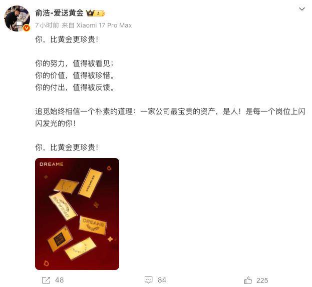 当日,追觅科技CEO俞浩发布多条微博提到此事,其中一条微博称,“你,比黄金更珍贵!”红星新闻记者注意到,俞浩的微博名字也改成了“俞浩-爱送黄金”。