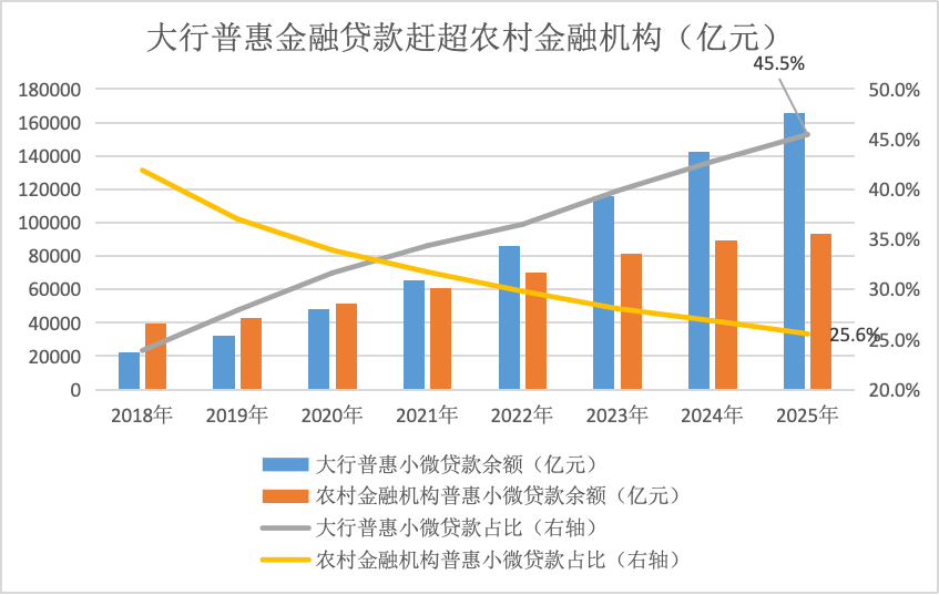国家金融监管总局数据显示,2018年-2025年9月末,大行普惠小微贷款余额增长6倍至16.6万亿,占比上升22个百分点至45.5%;同期农村金融机构普惠小微贷款余额仅增长1倍至9.3万亿,占比下降16个百分点至25.6%。