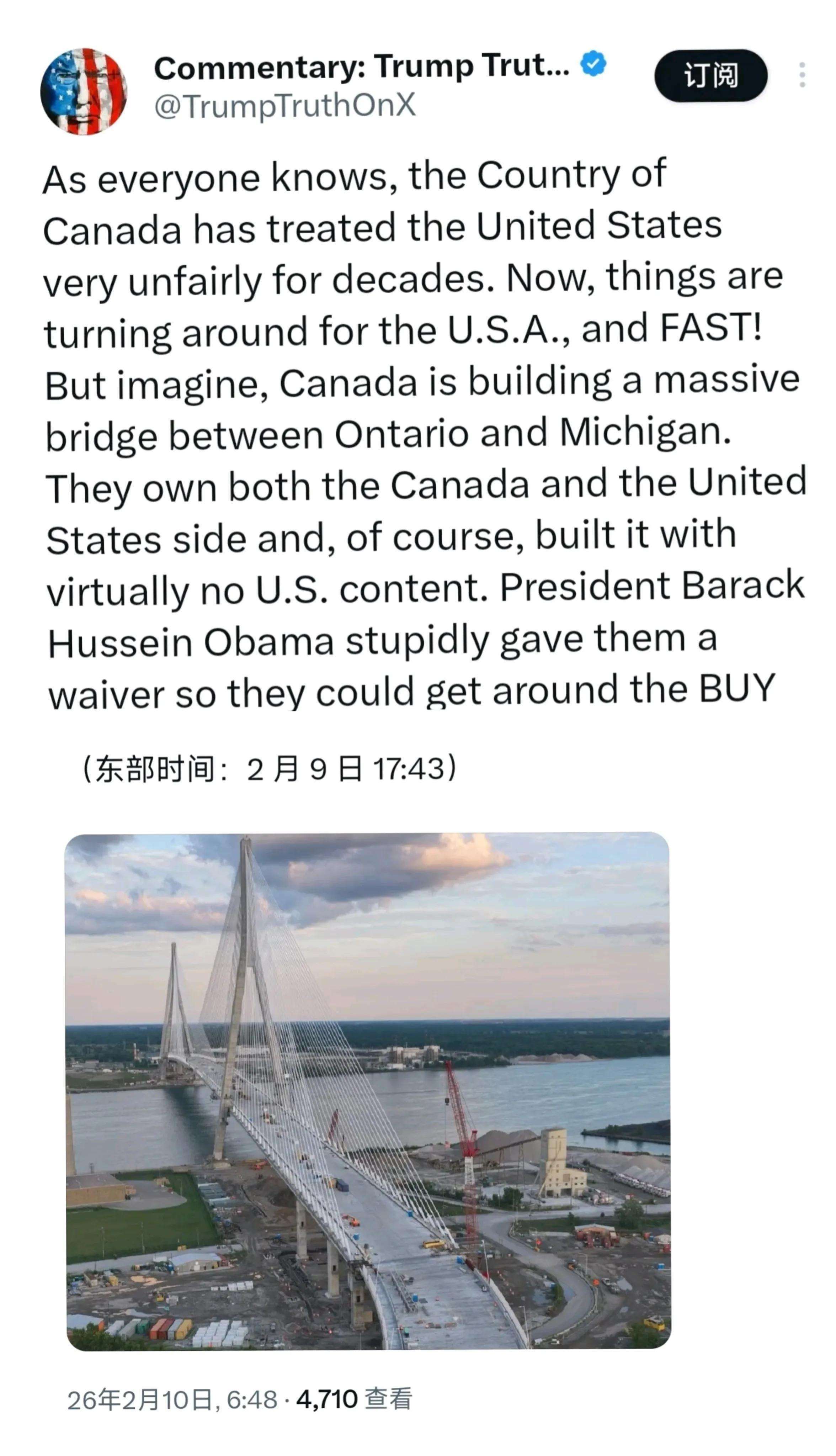 据《央视新闻》等媒体报道,2026年2月10日,美国总统特朗普在2月9日的声明中突然对加拿大发难,威胁要阻止一座造价高达46亿美元的跨国大桥通车。他的理由是加拿大占了美国的便宜,并要求加拿大交出大桥至少一半的所有权作为补偿,否则绝不允许这座即将完工的美加戈迪·豪国际大桥投入使用。