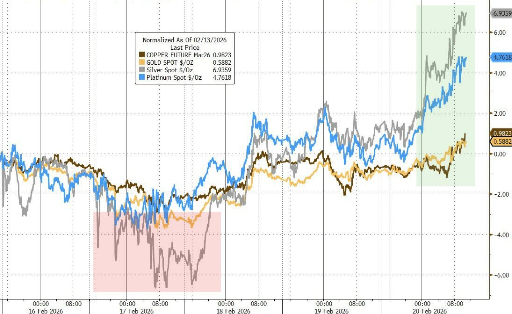 ,最高法裁决后特朗普动用替补工具,加征10%全球关税,放话关税会比之前“高得多”。政策混乱叠加疲软美元趋势,周五黄金涨超2%、重回5100美元。现货白银大涨8%。