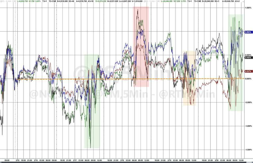 周五美国最高法院裁定特朗普关税违法,市场预期企业未来利润率压力减轻,风险偏好情绪推动美股盘中拉涨,全日显著震荡后三大股指均收涨。标普500指数上涨0.7%,本周累涨1.07%,创1月9日以来最佳单周表现。