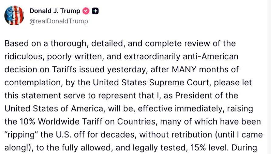 特朗普在文中称,“基于对美国联邦最高法院20日就关税问题作出的裁决进行全面、详尽且完整的审查——该裁决荒谬、措辞拙劣且极端反美”,“将自即日起,把目前对全球各国征收的10%统一关税,提高至完全被允许、并经过法律检验的15%水平。”