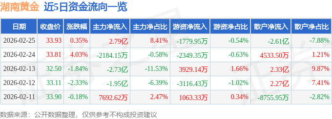 证券之星消息,截至2026年2月25日收盘,湖南黄金(002155)报收于33.93元,上涨0.35%,换手率6.31%,成交量98.55万手,成交额33.19亿元。