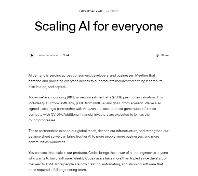 OpenAI于2月27日宣布,其获得了1100亿美元的新投资,公司估值达到7300亿美元。其中亚马逊投资500亿美元,英伟达及软银各投资300亿美元。此外,OpenAI还与亚马逊达成战略合作伙伴关系,并与英伟达达成了下一代推理计算的合作。