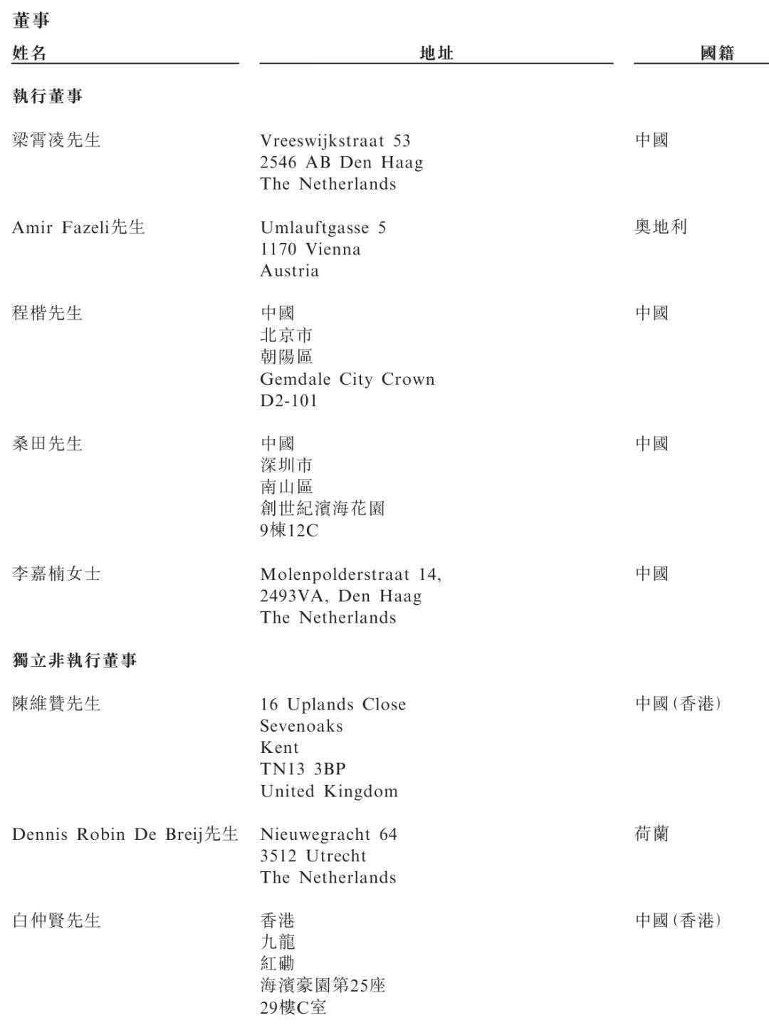 Radvance执行董事分别为梁霄凌、Amir Fazeli、程楷、桑田、李嘉楠女士;独立非执行董事分别为陈维赞、Dennis Robin De Breij、白仲贤。