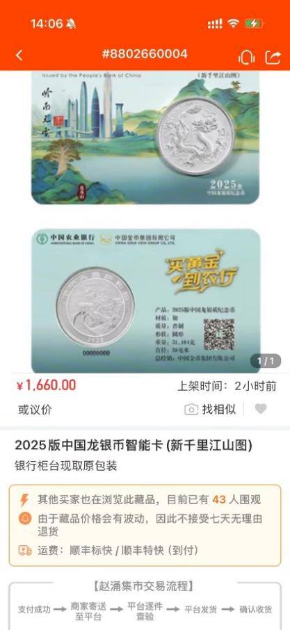 中国龙银币向来是收藏圈的焦点,样式丰富、版本繁多,加之近一年贵金属行情一路飙升,热度持续升温。回顾2025版中国龙银币的预约盛况:开放瞬间银行渠道与金币云商系统崩溃、页面卡顿、验证码延迟,二手市场随即出现明显溢价。昨天2025版中国龙银币智能卡(新千里江山图)正式发售,依旧上演“秒没”:农行线上页面卡死至10:30才恢复,线下柜台早早售罄。有藏友刚抢到便在赵涌集市以1550元售出,足见市场热度与信心。