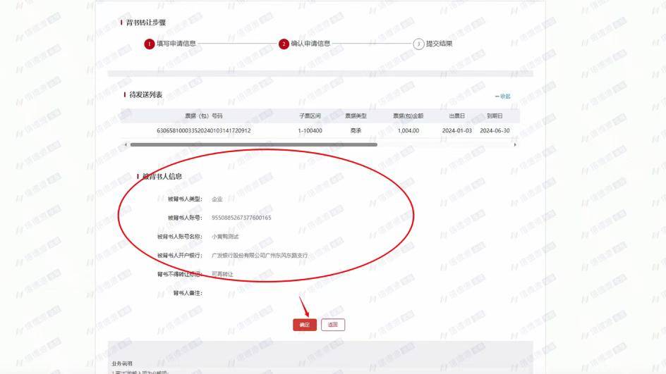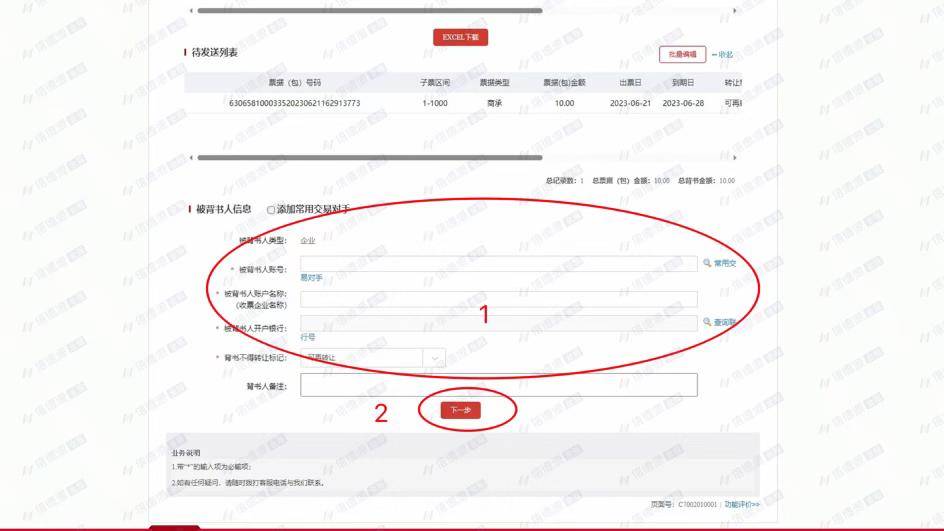 接下来输入被背书人账号,被背书人账户名称,被背书人开户银行,背书不得转让标记选择“可再转让”,点“下一步”。