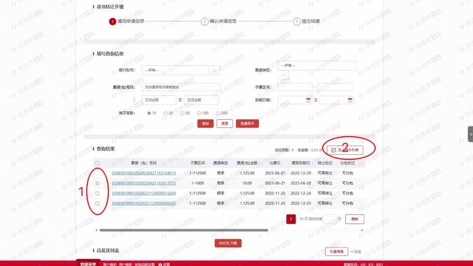 选择银行账号、票据类型选择“所有”,点“查询”,已持有在户的所有新一代票据,都会在列表中显示出来,选择需要背书转让的新一代票据,再点“加入指令列表”。