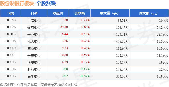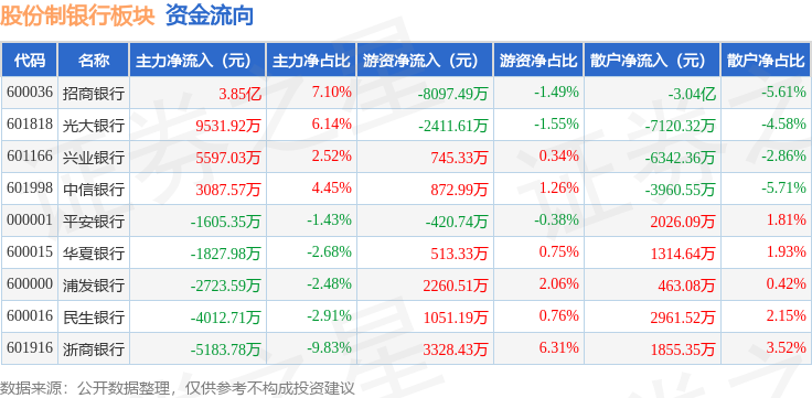 从资金流向上来看,当日股份制银行板块主力资金净流入4.14亿元,游资资金净流出2158.06万元,散户资金净流出3.92亿元。股份制银行板块个股资金流向见下表: