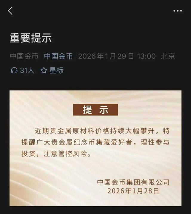 1月29日,中国金币集团发布公告,近期贵金属原材料价格持续大幅攀升,特提醒广大贵金属纪念币集藏爱好者,理性参与投资,注意管控风险。