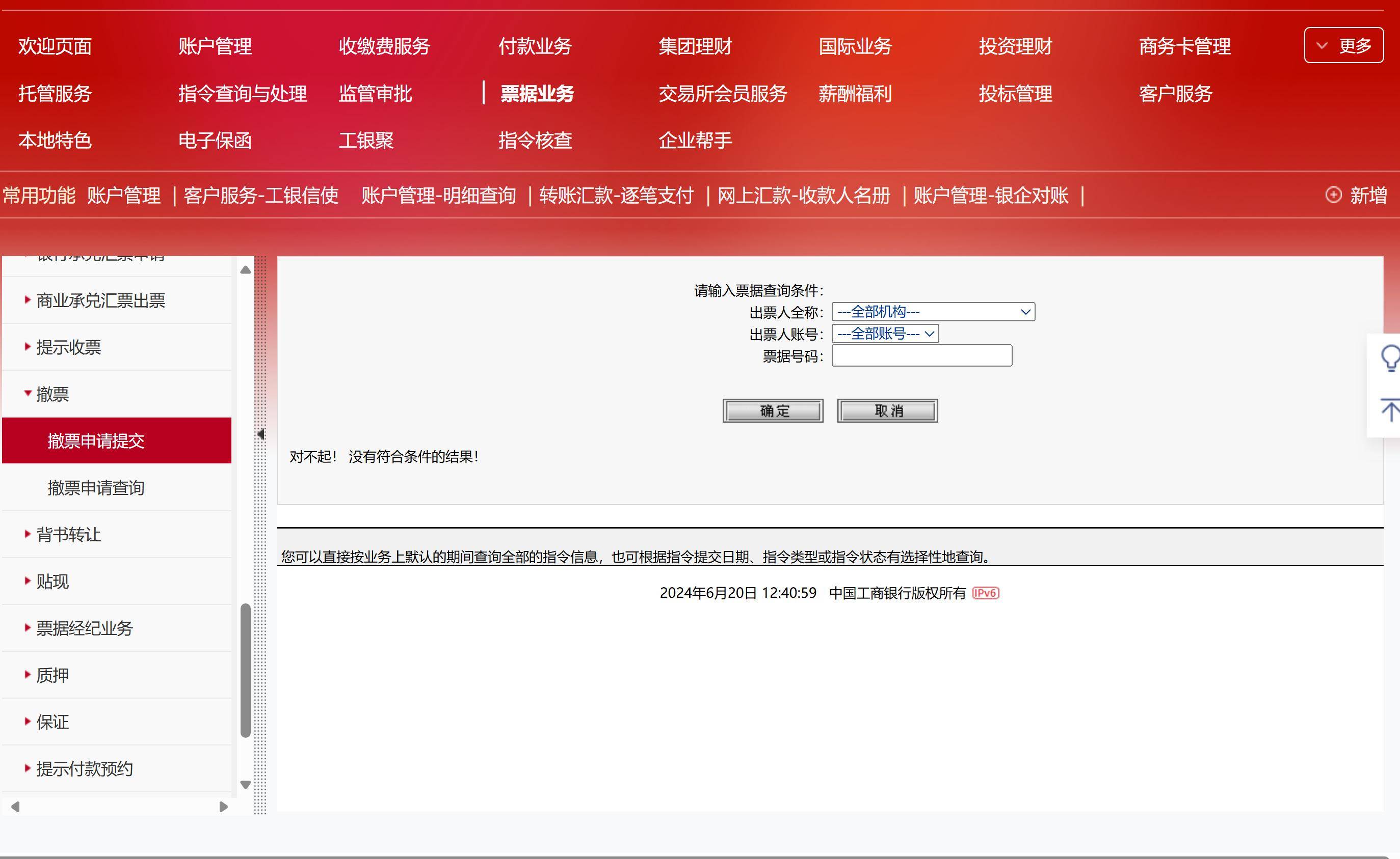 接下来点击 接下来点击 票据业务 - 电子商业汇票(新一代)- 背书转让 - 背书转让撤回,进入撤销申请页面,选择持票人全称、持票人账号、票据金额、背书转让申请日期,票据种类选择“全部”,再点“确定”,符合条件可供撤销的新一代票据,都会在列表中显示出来。选择需要撤销的票据,按提示完成撤销的经办操作。