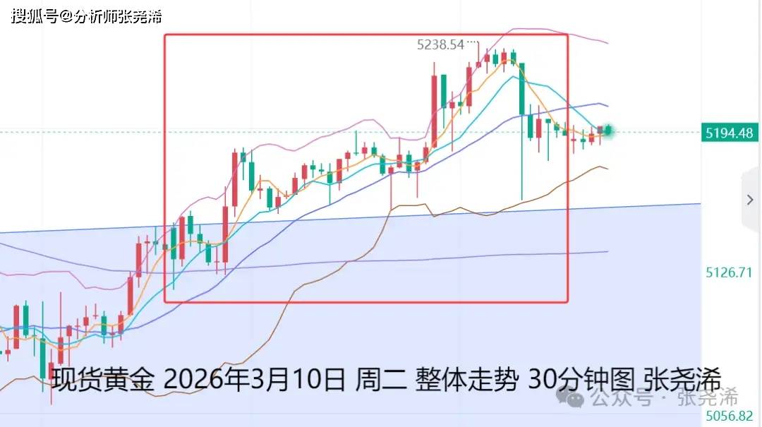 上交易日周二(3月10日):特朗普声称中东战争“很快就会结束”,但美国和以色列仍对伊朗进行了猛烈的空袭,市场正权衡特朗普对伊朗的矛盾信息,美元指数陷入震荡,但仍受到支撑买盘和通胀担忧缓解的提振,国际黄金维持多头动力,偏震荡收涨,收于中轨及短期均线上方,多头动力加强,也暗示短期有再度走强向上攀升,触及布林带上轨5340目标的预期。下方则关注5日或中轨线等支撑进行看涨入场。