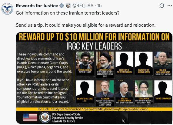 美国国务院“正义赏金计划”(Rewards for Justice)3月13日悬赏1000万美元,征集伊朗高级领导人的信息。