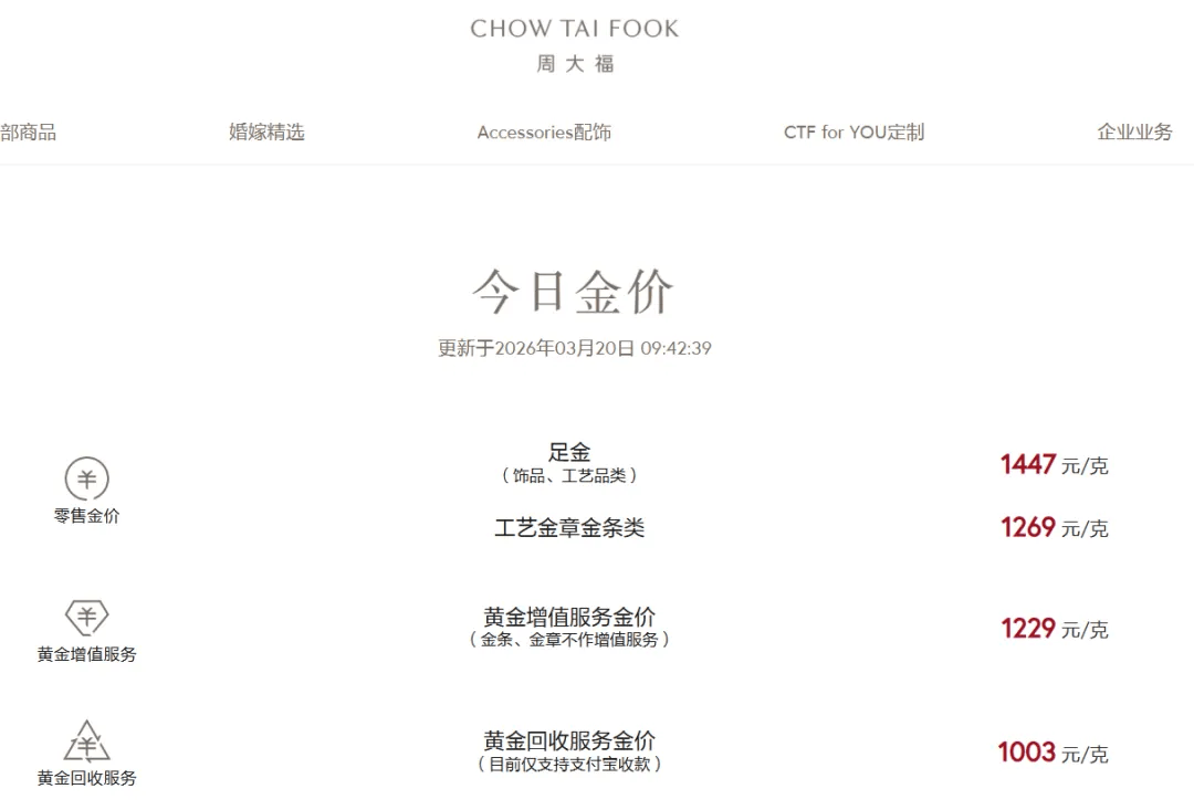 3月20日,国内多家金饰品牌足金报价较上一日大幅下跌。周大福官网显示,今日足金饰品价格为1447元/克,较前一日下跌56元/克,最近两日下跌104元/克。