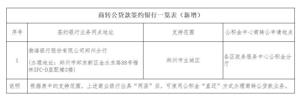 根据《郑州住房公积金管理中心关于商业银行个人住房贷款转住房公积金个人住房贷款有关事项的通知》(郑公积金〔2024〕15号),渤海银行股份有限公司郑州分行已与郑州住房公积金管理中心签订《商转公贷款业务合作协议》。现予以公布。