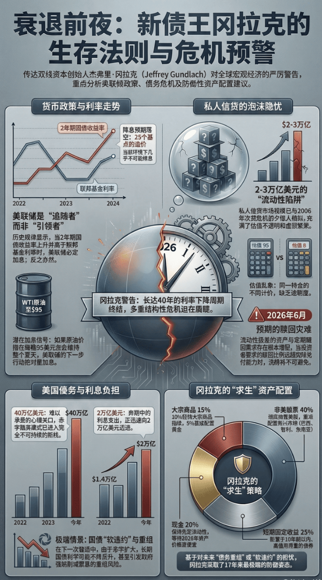 双线资本(DoubleLine Capital)创始人兼首席执行官、“新债王”杰弗里·冈拉克(Jeffrey Gundlach)在最新深度访谈中发出严厉警告:美国长达40年的利率下降周期已经终结,巨额债务正将经济推向不可持续的边缘,而狂热的私人信贷市场正如同2006年的次贷危机一样,酝酿着巨大的流动性灾难。