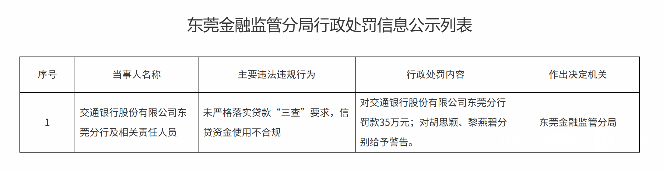 近日,广东金融监管局官网披露一张罚单:因未严格落实贷款“三查”要求,信贷资金使用不合规,交通银行东莞分行被东莞金融监管分局处以35万元罚款,两名相关责任人员被警告。