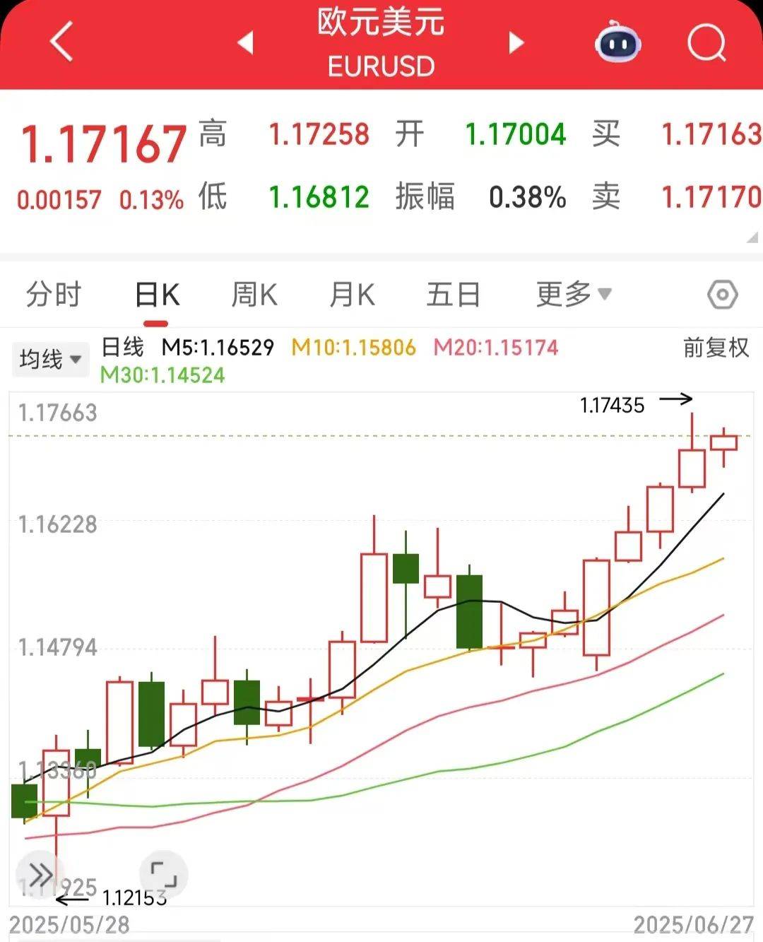 近期,欧元对美元汇率屡创新高。继6月24日突破1比1.16关口后, 欧元对美元汇率6月27日升至1比1.17,达到2021年9月以来的最高水平。6月27日,截至北京时间15时48分,欧元对美元报价1.17167,上涨0.13%。