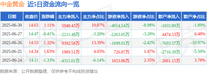 证券之星消息,截至2025年6月30日收盘,中金黄金(600489)报收于14.63元,上涨1.11%,换手率0.78%,成交量37.68万手,成交额5.47亿元。
