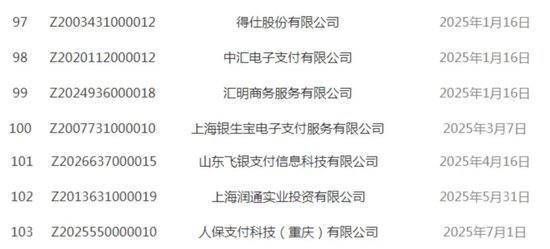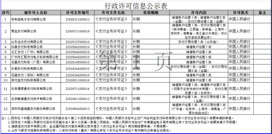 山东飞银支付信息科技有限公司、人保支付科技(重庆)有限公司在《支付业务许可证》有效期内已申请主动退出。