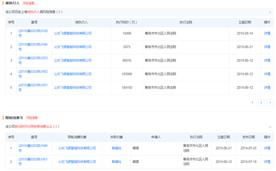 据天眼查,山东飞银支付信息科技有限公司在更名前,有九条被执行人高风险信息。此外,另有两条被法院列为限制高消费企业的相关信息。