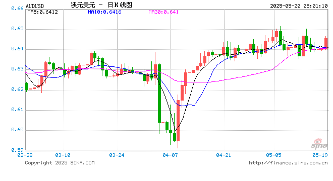 新浪外汇消息2025年05月20日,截至05时00分,外汇市场上澳元兑美元汇率突破1澳元兑换0.6456美元。涨幅为0.8703%