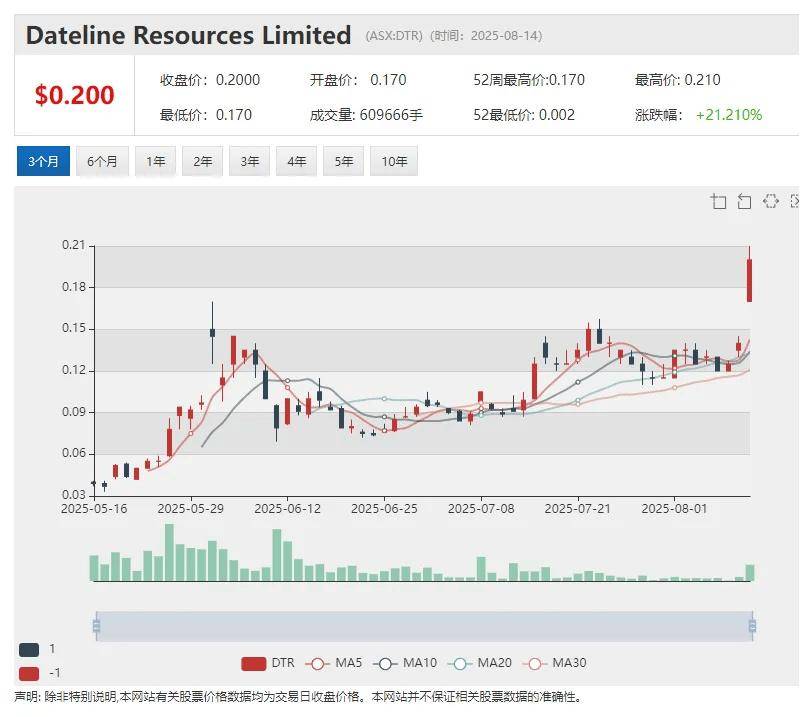 有望开发出“美国第二座稀土元素矿山”的Dateline Resources Ltd (ASX股票代码:DTR)在创出年内40倍上涨后,进入8月仍延续劲涨势头。