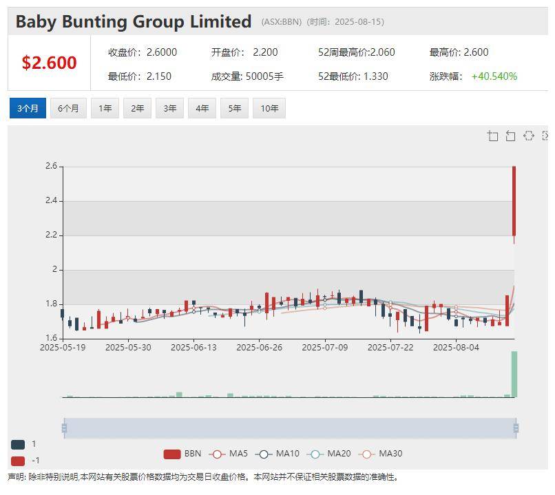 澳大利亚领先的婴幼儿用品零售商Baby Bunting Group Limited(ASX: BBN)公布截至 2025 年6月29日的财年(FY25)业绩。受业绩增长影响,周五早盘该股股价跳空放量上涨,截止中午时分,股价最高上行至2.465澳元,对应涨幅逾三成。