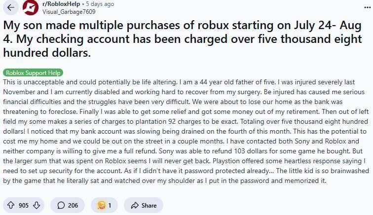 自己的孩子悄悄氪金游戏,如今这个可谓放之四海皆准,近日一位老外父亲在Reddit发帖求助,自己的孩子在自己不知情情况下悄悄在PS5版罗布乐思上氪金5800美元,因为近期家里经济困难,联系官方寻求退款无果。