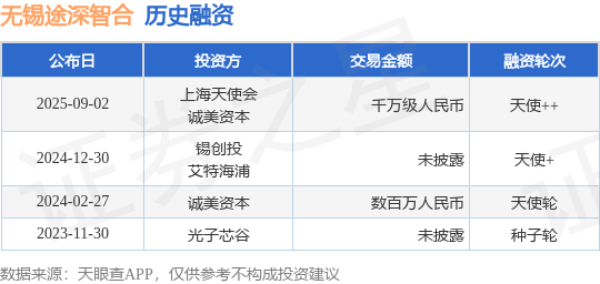 证券之星消息,根据天眼查APP于9月2日公布的信息整理,无锡途深智合人工智能科技有限公司天使++融资,融资额千万级人民币,参与投资的机构包括上海天使会,诚美资本。