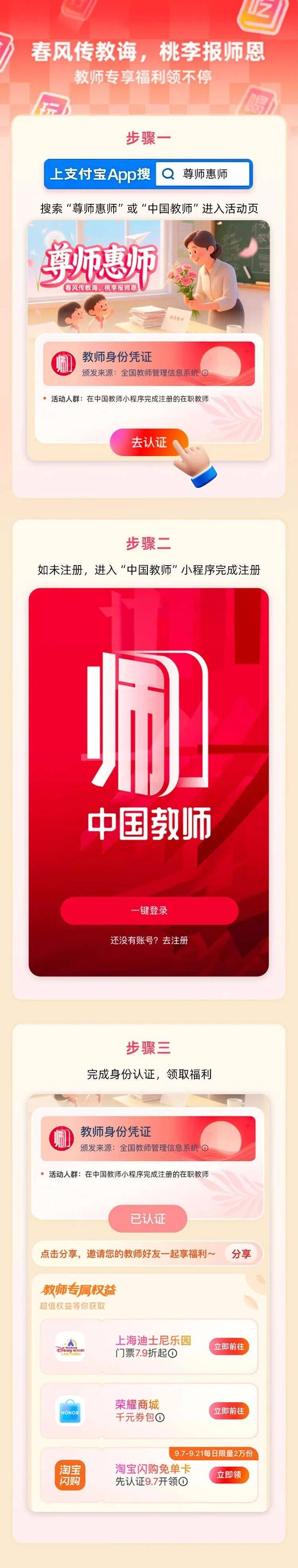 此外, 教育部“中国教师”支付宝小程序也已正式上线,除了提供政策资讯、培训查询外,还能便捷参与此次尊师惠师活动,让教师服务数字化再升级。尊师惠师是一项长期工程,后续支付宝也将持续发力,联合各方为教师群体带来更多福利与服务。