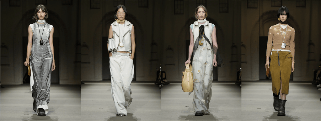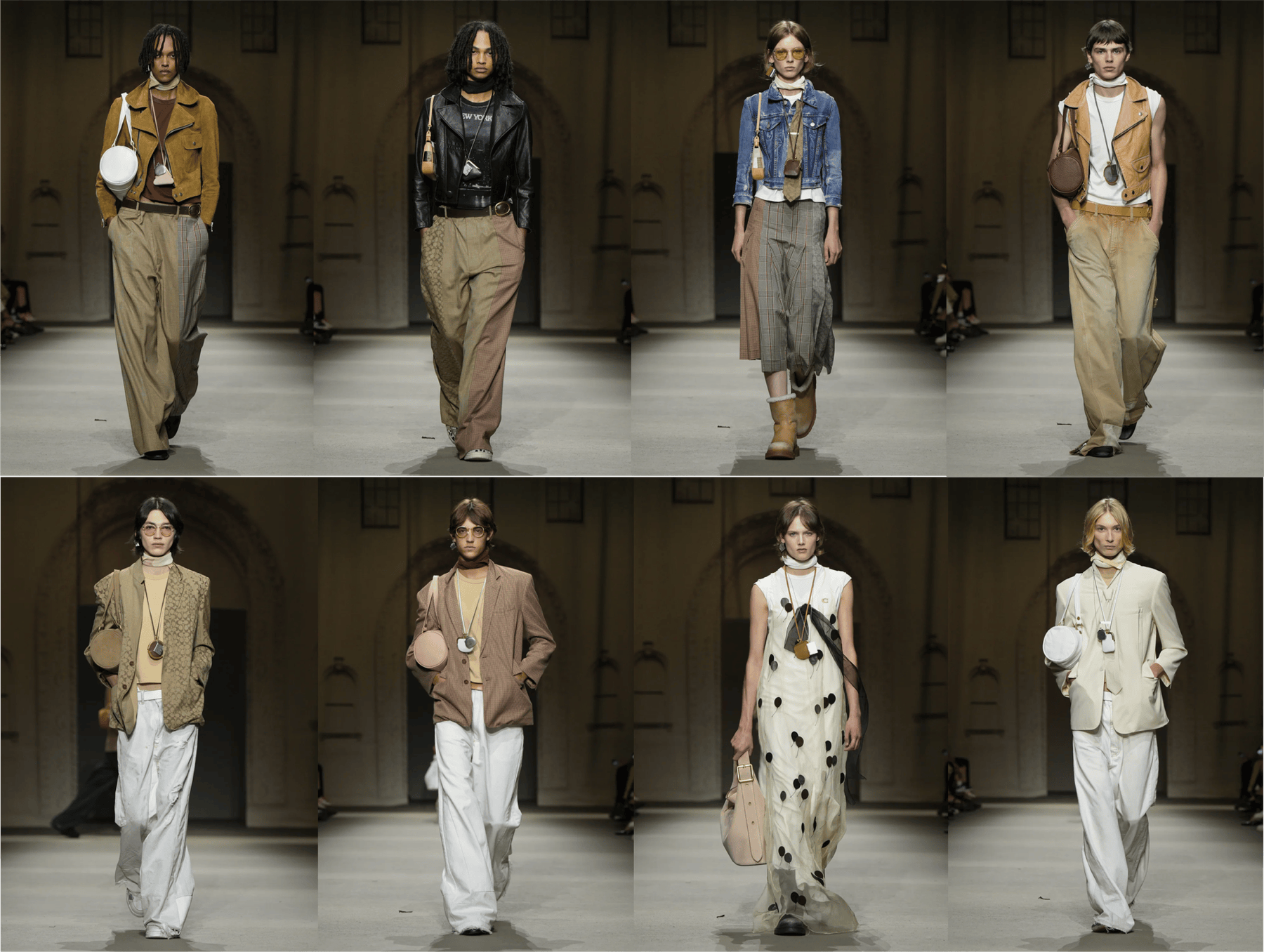 2026 春季系列灵感源自纽约街头的活力与生机,采用多种精制皮革:麂皮与纳帕皮革呈现柔软蜡感,做旧效果与擦色箔片元素点缀其间。下装方面,既有采用再生牛仔布与工装面料打造的休闲裤,亦有剪裁利落的西装裤与半身裙。本季色调以浅色系为主,将白色、蜜棕色、棕褐色与褪黑色交织;柔和的粉蓝、粉黄、粉绿以及亮眼的金属色,为整体造型增添层次。