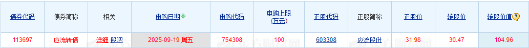 应流转债对应的正股当前股价为31.98元,转股价为30.47元,转股价值104.96,转股价值高。参照相似可转债的估值以及应流转债目前的转股价值,预估中签将是300元以上的铂金级肉签一枚!