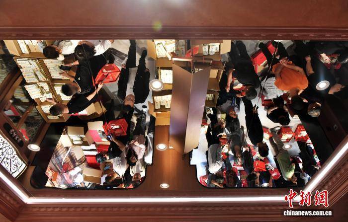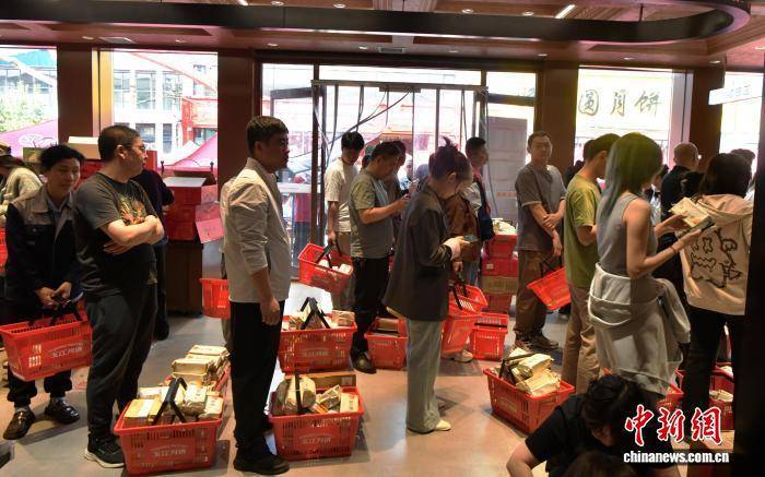 9月19日,中秋节将至,河北省石家庄市藁城区九门回族乡黄庄村一家月饼销售门店,购买月饼的民众排队结账。该村以生产月饼闻名,目前83家月饼生产企业日产月饼约150吨,这些月饼将销往全国各地。中新社记者 翟羽佳 摄