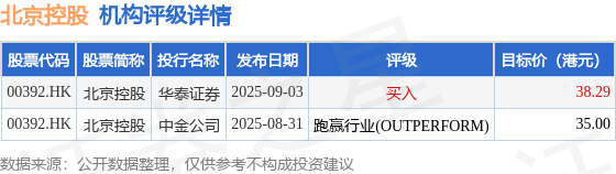 截至2025年9月19日收盘,北京控股(00392.HK)报收于33.84港元,下跌0.41%,成交量295.21万股,成交额9998.87万港元。投行对该股的评级以跑赢行业(OUTPERFORM)为主,近90天内共有1家投行给出跑赢行业(OUTPERFORM)评级,近90天的目标均价为36.64港元。华泰证券最新一份研报给予北京控股买入评级,目标价38.29港元。