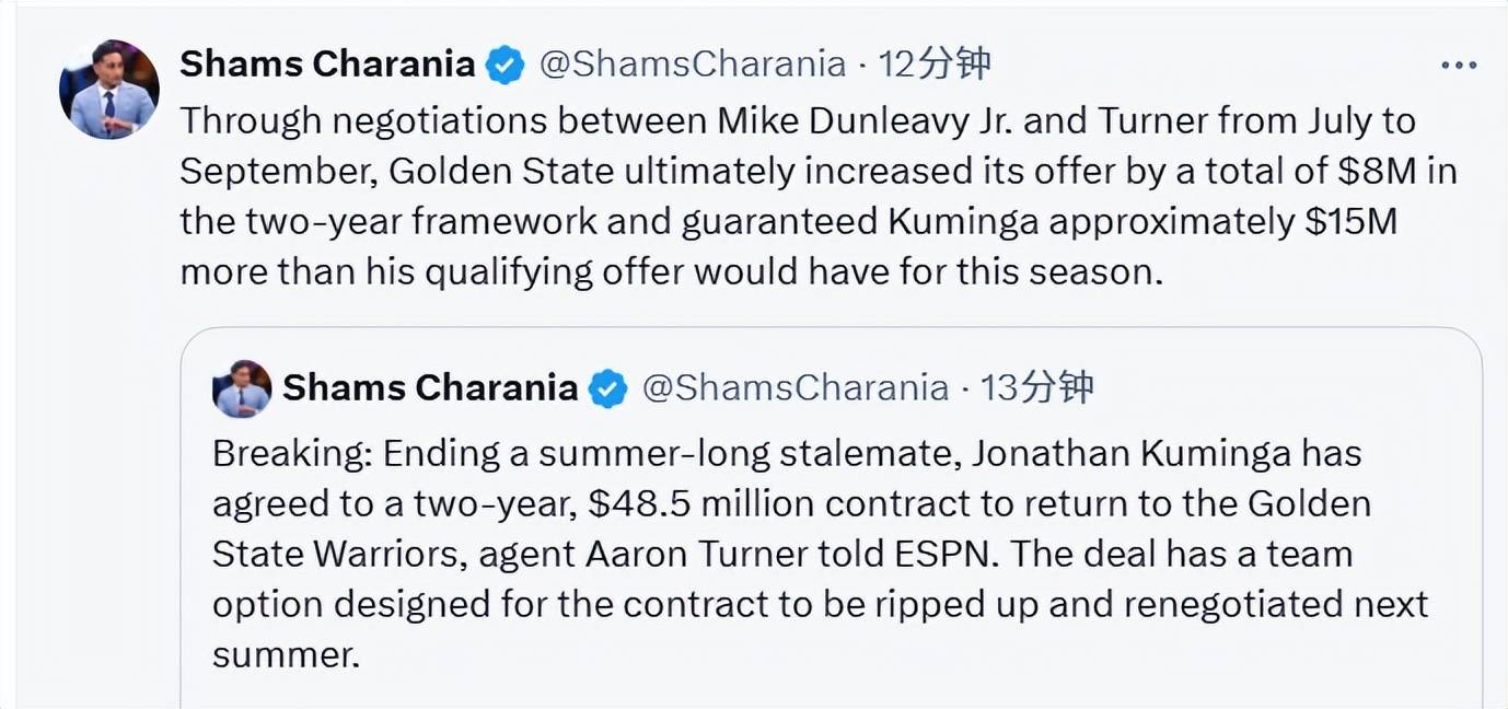 从7月到9月,小迈克-邓利维与特纳持续谈判,最终勇士队在两年合同框架内将报价总额提高了800万美元,且本赛季为库明加提供的保障金额,比其资质报价高出约1500万美元。