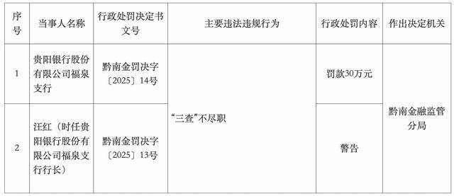 具体来看,因“三查”不尽职,贵阳银行股份有限公司福泉支行被罚款30万元,汪红(时任贵阳银行股份有限公司福泉支行行长)被警告。