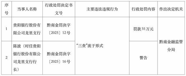 因“三查”流于形式,贵阳银行股份有限公司龙里支行被罚款35万元,陈波(时任贵阳银行股份有限公司龙里支行行长)被警告。